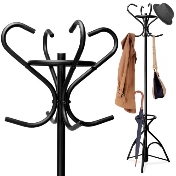 ✅Dodatkowe funkcje: Obok głównej konstrukcji, wieszak wyposażony jest w uchwyt na parasole oraz dodatkowe wsporniki przy nogach, zwiększające jego stabilność.