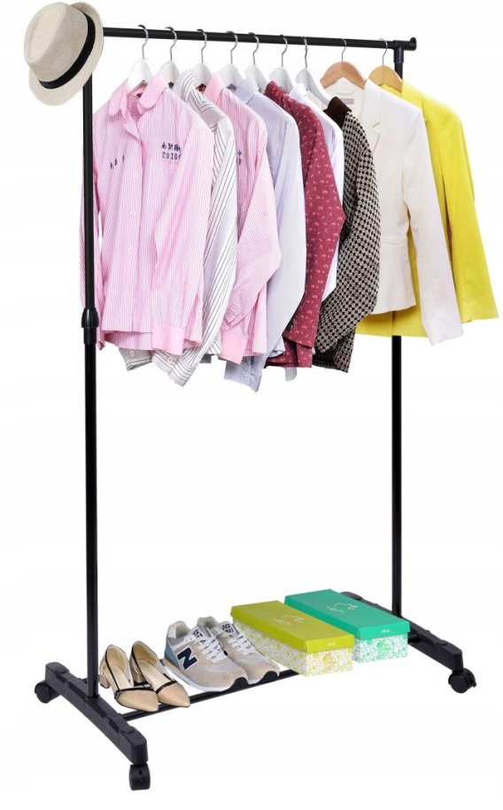 Praktyczny i wytrzymały wieszak garderobiany na kółkach. Wieszak BES sprawdzi się w każdym domu i w biurze, w którym brakuje miejsca do powieszenia odzieży. Nasz produkt został wyposażony w wytrzymały drążek, który pomieści naprawdę dużo odzieży. Dodatkowym atutem wieszaka są nakładki na końce drążka, uniemożliwiające zsunięcie się wieszaków z odzieżą. Montaż wieszaka jest niezwykle prosty i nie wymaga użycia narzędzi. Czarny kolor wieszaka sprawi, że doskonale wpisze się w każdy styl wnętrza, w szczególności glamour i loft.