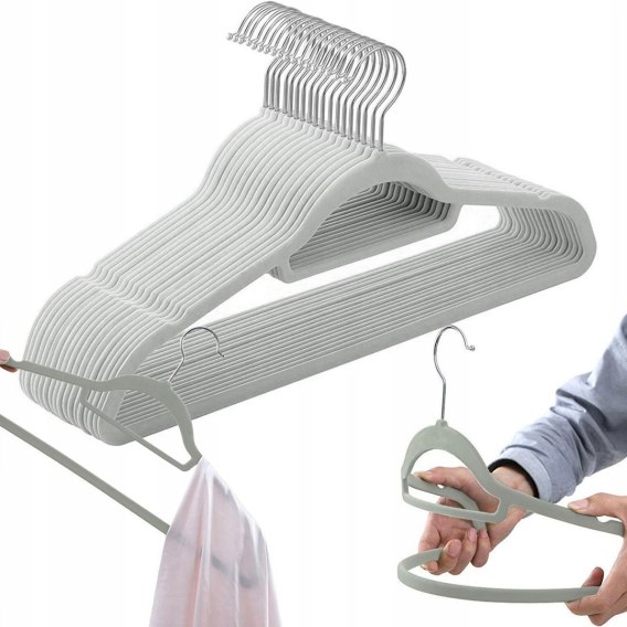 Zestaw wieszaków na ubrania to podstawowy element wyposażenia naszych szaf. Szczególnie popularne są w ostatnim czasie wieszaki welurowe, ponieważ zajmują mało miejsca a ich antypoślizgowa powłoka sprawia, że ubrania nie ześlizgują się i pozostają gładkie.