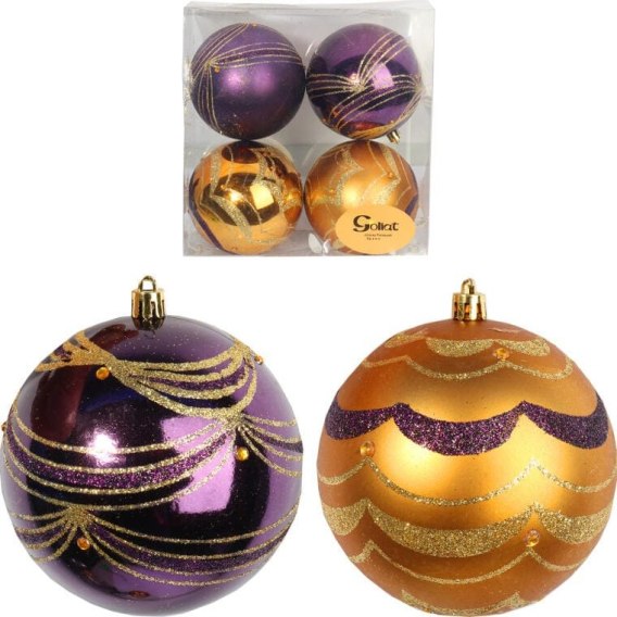 Zestaw 4 Plastikowych Bombek z Brokatowym Dekorem 10 cm - Złote i Fioletowe