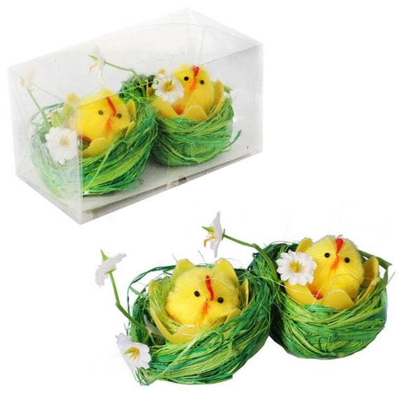 Zestaw Dekoracyjny Wielkanocne Pisanki - 2 Miękkie Kurczaczki w Sizalowych Gniazdach 6cm