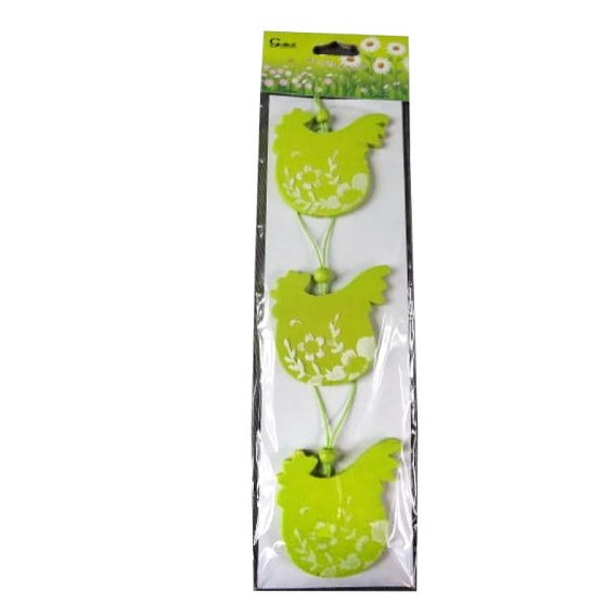 Komplet trzech drewnianych zawieszek w kształcie kurek w kolorze zielonym z białą dekoracją to wspaniała propozycja dla wszystkich, którzy pragną dodać swojemu wnętrzu wyjątkowego charakteru. Każda zawieszka ma wymiary 6 x 6 cm, co sprawia, że idealnie nadaje się do zawieszenia w różnych miejscach, takich jak drzwi, okna, czy na gałązkach w dekoracyjnych kompozycjach.