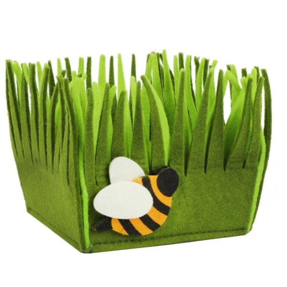 Osłonka z filcu w kolorze zielonym to uroczy dodatek, idealny na wiosenne święta. Jej wyjątkowy wzór przedstawiający trawkę z pszczółką nadaje jej lekkości i radosnego charakteru. Przeznaczona głównie jako koszyczek dla dzieci, doskonale sprawdzi się na słodkie jajeczka, prezenty wielkanocne oraz jako koszyk do Kościoła, idealny na procesję lub podczas nabożeństw, ponieważ nie posiada uchwytu.