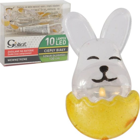 Prezentujemy urokliwe lampki wielkanocne w formie girlandy świetlnej LED z uśmiechniętymi zajączkami, które stanowią doskonałą ozdobę na nadchodzące święta. Ta stylowa dekoracja świetnie sprawdzi się w pokoju dziecięcym, salonie, sypialni oraz w ogrodzie, wprowadzając radosny nastrój i tworząc wyjątkową atmosferę. Delikatne, ciepłe oświetlenie nocne nie tylko zapewnia przytulność, ale także zachwyca zarówno domowników, jak i gości. Nasze lampki idealnie nadają się na prezent wielkanocny, dodając uroku każdemu wnętrzu. Zestaw zawiera 10 źródeł światła, które są zasilane bateriami 2 x AA R6 1,5 V (baterie nie są dołączone), co pozwala na łatwą aranżację w dowolnym miejscu. Lampki wykonane są z wysokiej jakości tworzywa sztucznego, mają długość 1,30 m oraz średnicę zajączków wynoszącą 2 cm. Posiadają stopień ochrony IP20, co czyni je idealnymi do stosowania w pomieszczeniach. Wybierz nasze lampki wielkanocne w formie girlandy, aby wzbogacić swoje wnętrze o oryginalne akcenty i cieszyć się niepowtarzalnym klimatem podczas świąt.