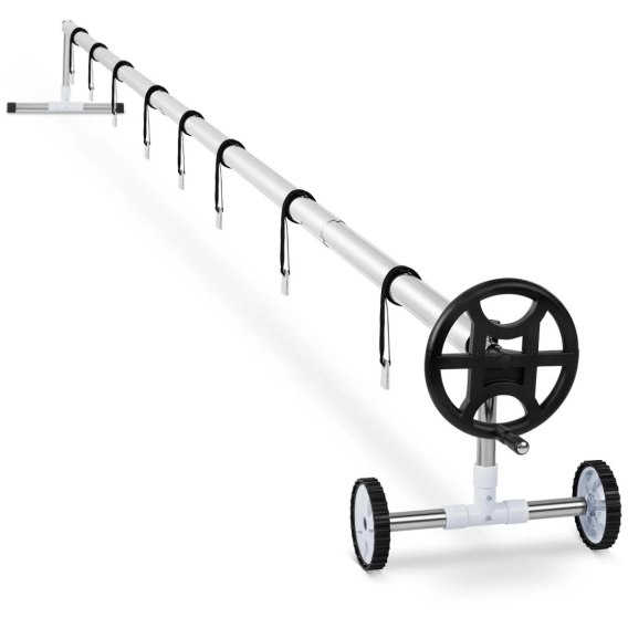 Rolka zwijająca do folii solarnej marki Uniprodo to niezbędny sprzęt sprawdzający się do zwijania i rozwijania osłony na basen aby chronić wodę przed zanieczyszczeniami i wychłodzeniem. Wyróżnia się trwałą konstrukcją oraz łatwą i bezwysiłkową obsługą. Urządzenie posiada regulowaną szerokość, co pozwala na wykorzystanie do zbiorników o wymiarach od 4,2 do 5,2 m. Można do niej zamontować również wszystkie popularne typy folii solarnych. Podstawa w kształcie litery T na jednym końcu i ciężkie koła na drugim zapewniają stabilność, a jednocześnie mobilność. Urządzenie wykonano z aluminium, stali nierdzewnej oraz tworzyw sztucznych, dzięki czemu sprzęt nie koroduje, a metalowe części pozostają jasne i lśniące nawet po latach użytkowania. Stal ma wysoką odporność na uderzenia czy odkształcenia, za to aluminium jest bardzo lekkie i wytrzymałe. Zwijarkę obsługuje się ręcznie za pomocą korby, co pozwala szybko rozwinąć lub zwinąć osłonę na basen. Obsługą zwijarki bez problemu może się zająć jedna osoba, co ułatwia czyszczenia i konserwację basenu.